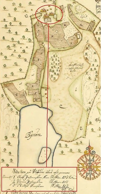 Låt oss inledningsvis titta på 1712 års avrösningskarta över Norra Ulvön – ”Geometrisck afrösningh uppå Ulffööns Södre Büen uthi Nätra socken och Ångermanlands Norre Contract…”.[1] Syftet med kartan är att redovisa vad Sörbyns bönder äger och får nyttja i form av åker och äng m m på Ulvön och Ytterön inklusive sjöarna. Under bilden av Bysjön redovisas vilka bönder och gårdar det handlar om. Här beskrivs tre gårdar i Sörbyn: