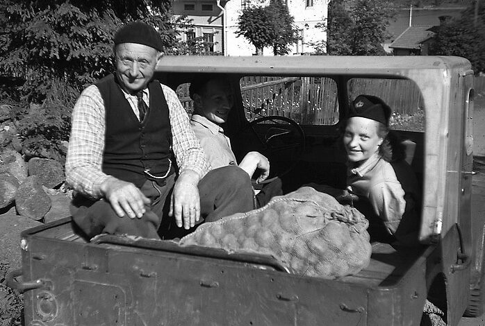 På flaket sitter bonden Gideon Bergström. Övriga är okända.